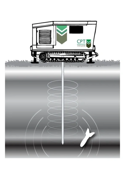 A magnetometer probe (cone) is pushed in the ground by hydraulic pressure to survey the column of soil to detect for deep unexploded ordnance (UXO-UXB). Every survey position provides a column of clearance down to maximum bomb penetration depth or upon refusal due to dense natural strata,. Due to our probe (cone) radius we can often capture multiple pile locations per survey.
